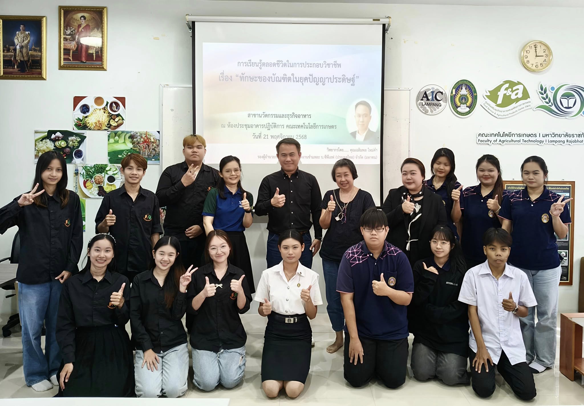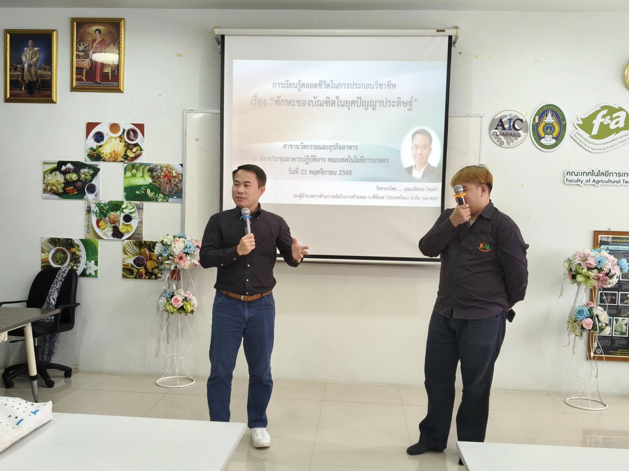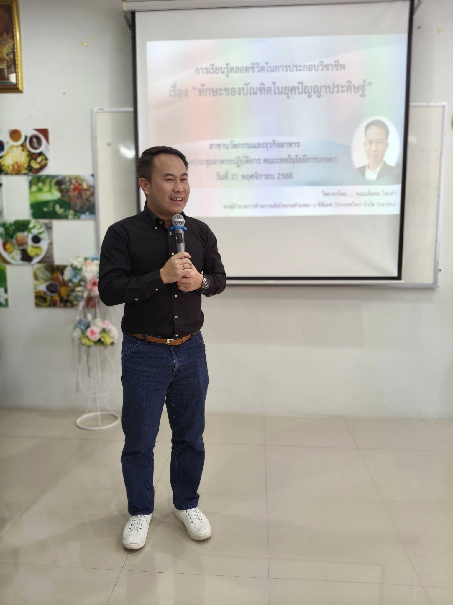 กิจกรรมเชิญวิทยาบรรยายในรายวิชา การควบคุมและประกันคุณภาพผลิตภัณฑ์อาหาร วันที่ 21 พฤศจิกายน 2568 เวลา 11:06 น. อ่านแล้ว 106 ครั้ง กิจกรรม กิจกรรมเชิญวิทยาบรรยายในรายวิชา การควบคุมและประกันคุณภาพผลิตภัณฑ์อาหาร วิทยากรโดย คุณเฉลิมพล ใหม่คำ รองผู้อำนวยการด้านการผลิตโรงงานชำแหละ บริษัท ซีพีเอฟ (ประเทศไทย) จำกัด มหาชน ภาพกิจกรรมทั้งหมด (6 รูป)