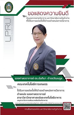 คณะเทคโนโลยีการเกษตร มหาวิทยาลัยราชภัฏลำปาง ขอแสดงความยินดีกับบุคลากรสายวิชาการ ที่ได้รับแต่งตั้งให้ดำรงตำแหน่งทางวิชาการ รองศาสตราจารย์
